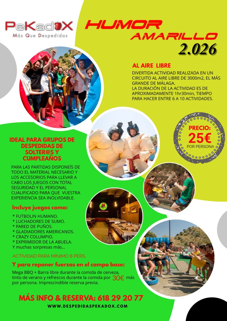 Cualquier ocasión es buena para venir a disfrutar de una actividad diferente y muy divertida con sus dos modalidades al aire libre o en un recinto cerrado. Estas pruebas de Humor Amarillo son ideales para eventos como las despedidas de solteras, solteros, cumpleaños, actividades para empresas, fiestas, etc… Una actividad cargada de risa y diversión donde los participantes para ganar tienen que demostrar todas sus habilidades de destreza y trabajo en equipo.